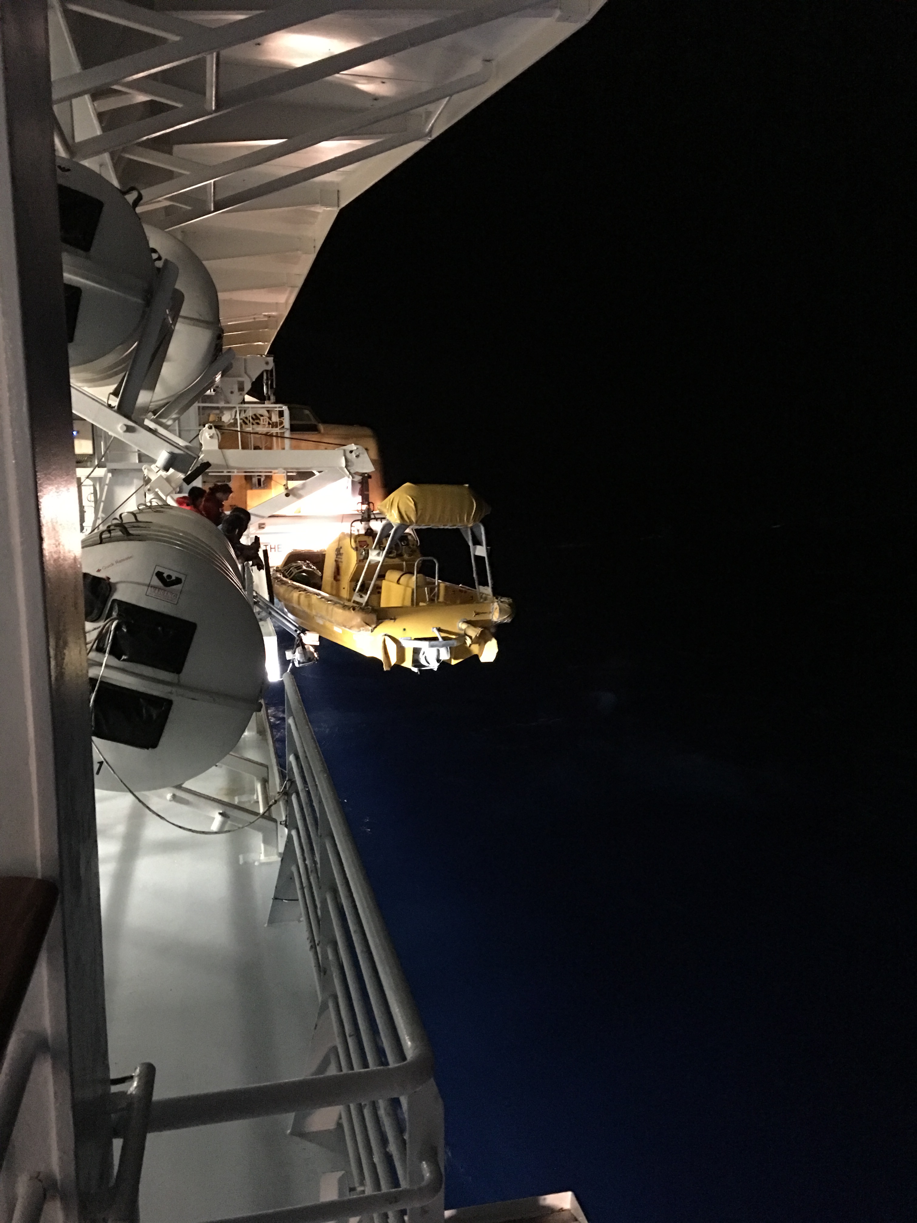 I was curious, but half asleep. I almost ignored it, but since we were on the port side I decided to have a look. I first checked our peephole to the cruise hallway. Nothing. Then to our balcony door. First thing I noticed was the cruise ship had stopped moving. Next I could see a spotlight pointed toward a bobbing light in the ocean. My neighbors were out on their balcony.